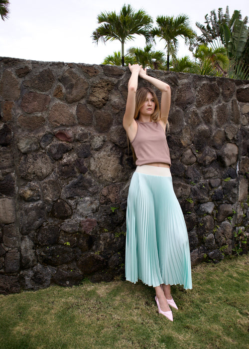casual yet sophisicated this skirt is crafted in indigo japanese denim and hand pleated locally in an artisan factory. the sunburst design features an unfinished hem and an exposed salvage side seam