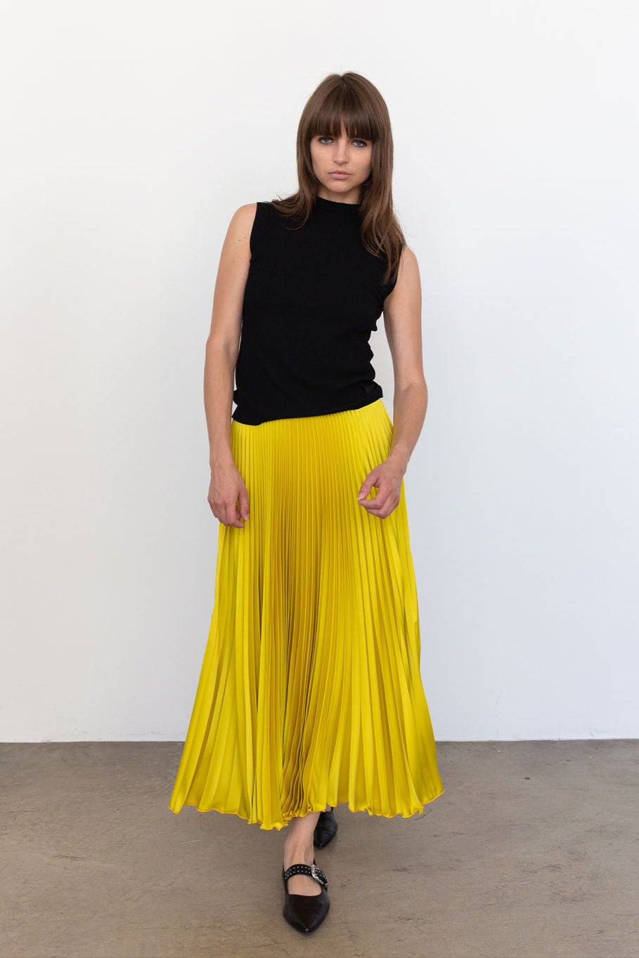 classic sunburst pleated satin skirt with elasticated waistband in CHARTREUSE